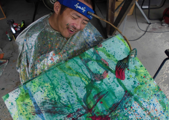 1972年松阪市生まれ。仮死状態で生まれその後脳性マヒが判明。両手足の機能と言語に障害が残った。1991年からまつさかチャレンジドプレイス希望の園に通所し絵画制作を始める。自由に動かせるのは頭部のみで、スティックのついたヘッドバンドに絵筆を取り付けて制作を行う。時には自らの体に絵具を塗りつけ、キャンバス上を暴れるアクションペインティングを展開。2002年、2004年、2009年には松阪市美術展覧会にて入選。2011年、2013年にはみえ県展にて入選を果たす。